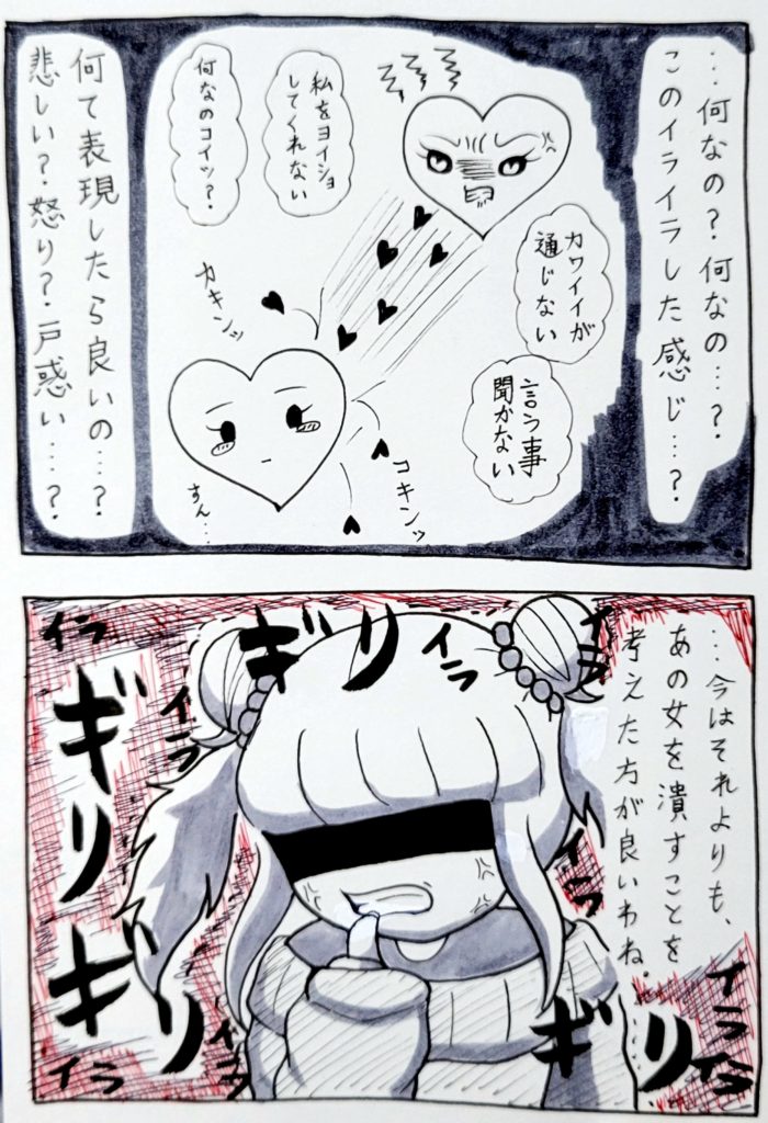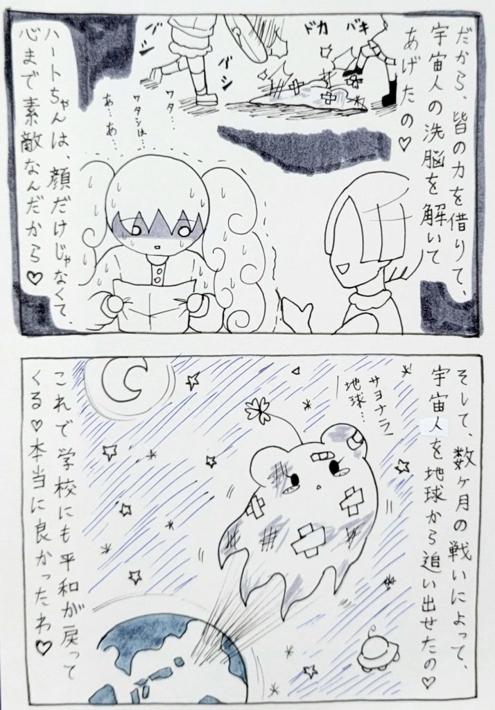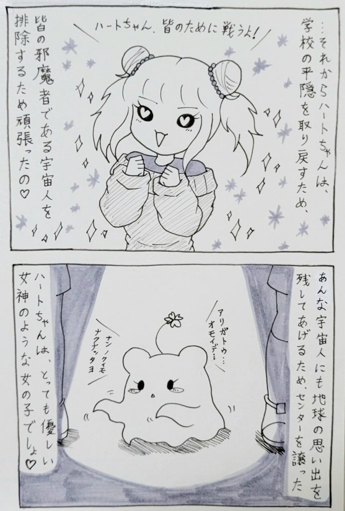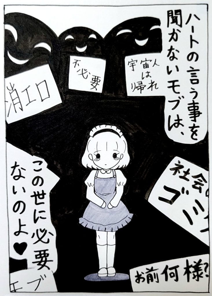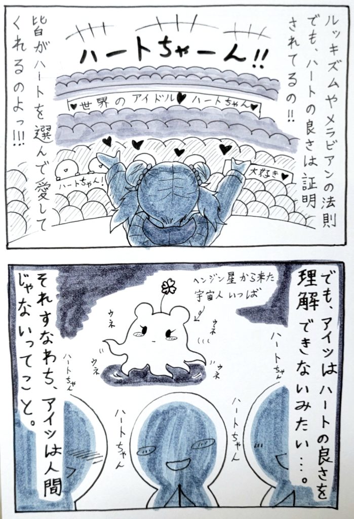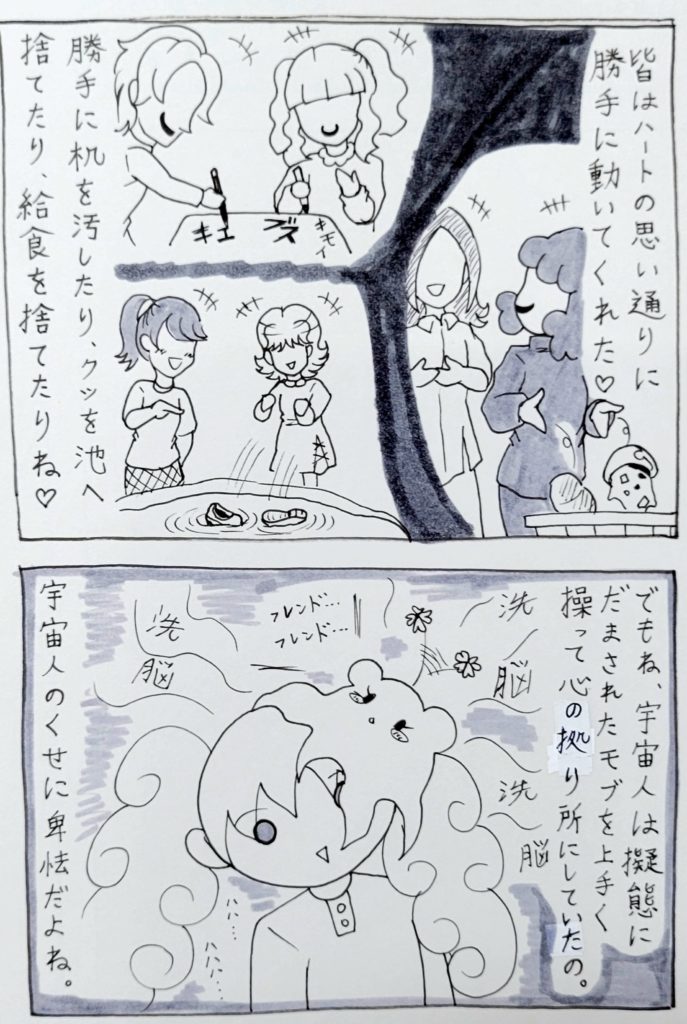 ハートちゃんの中では、自分が気に入らない相手=追い出せば皆ハッピー♡・いじめ?違うよ?これは宇宙人退治なの♡あの子は人間じゃないんだよ♡という解釈になるので、罪悪感や悪いことをしている、という認識が一切ないのです……。