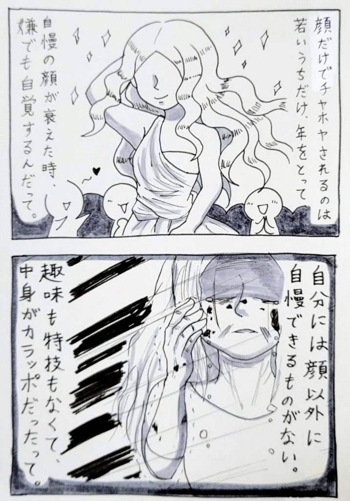 「容姿が全てだと自負している人は、それがなくなった時、自分は空っぽな人間だったと後悔するんだって。」と……。